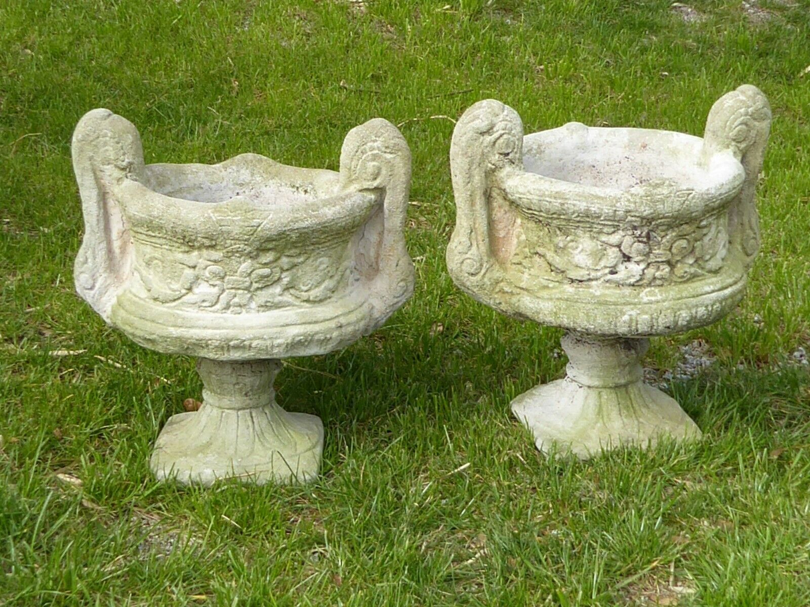 Stylish set of roman inspired garden urns, garden pedestal planters highly detailed planters with tall swan neck handles & classic floral detailed bases, they are now starting to weather down.
